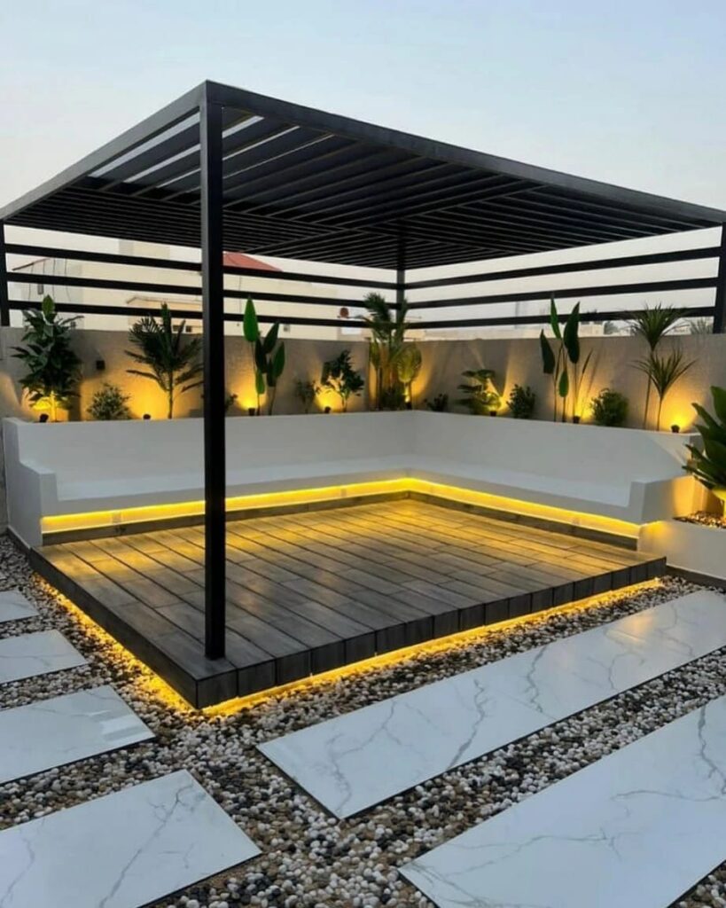 وايضا نقوم بتصميم وتنفيذ المظلات والأسترحات والممرات بأحدث التصميمات وأجود الخامات لتعطي أفضل عمر أفترضي وتعطي حديقتك الشكل المصالي لمنزل العصري